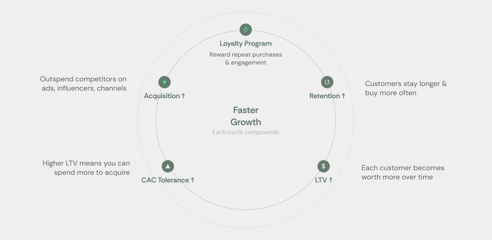 The most important mental model in modern retention is the flywheel. It's not a funnel with a beginning and an end — it's a compounding loop where every dollar invested in loyalty accelerates everything else.